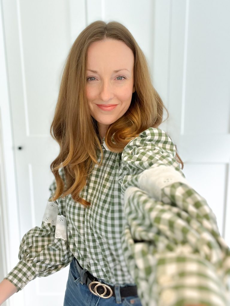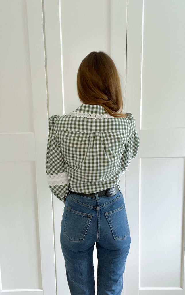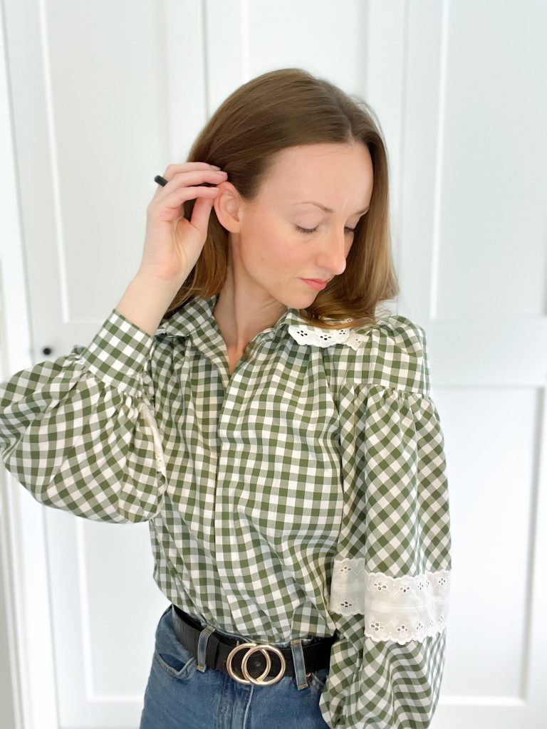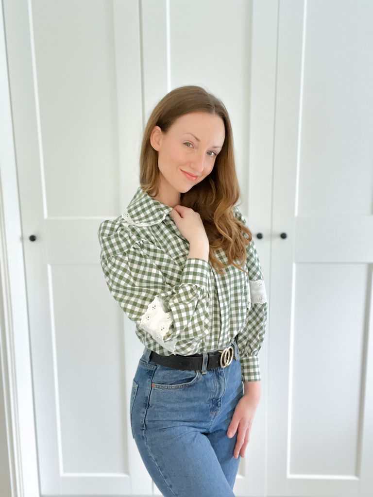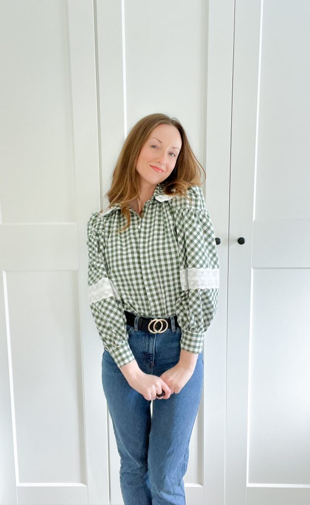 It took a week of evenings, after Elsie had gone to bed for me to get it washed, cut out and sewn together. The excitement to see the finished blouse was driving me to get it done. My sewing spark had been relit, thanks to the green gingham cotton chambray. Thank goodness! The blouse needed some small, subtle buttons. So I took all the buttons off of a Ralph Lauren shirt. (A shirt I don’t wear anymore, without it’s buttons, its still fully wearable for gardening or painting in so it won’t go in the bin.) The buttons were just too perfect to not use them. The night before my birthday, I had completed the button holes and added the buttons on, ready to wear for tea and cake at my parent’s house.